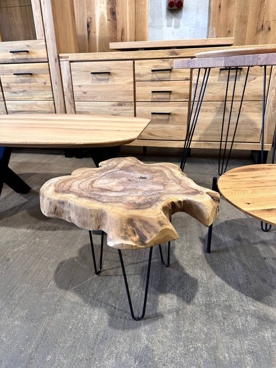 Dieser Couchtisch ist ein echtes Unikat – kein Stück gleicht dem anderen. Jede Tischplatte wird aus einem Stück massivem Naturholz gefertigt und behält ihre individuelle Form, Maserung und Farbe. So entsteht ein einzigartiges Möbelstück, das mit seinem rustikalen Charme und seiner organischen Silhouette sofort ins Auge fällt.